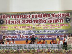 पाली। ऑल राजस्थान एडवोकेट फेडरेशन द्वारा आयोजित दो दिवसीय राज्य स्तरीय अधिवक्ता कॉन्फ्रेंस का भव्य शुभारंभ पाली-जाडन स्थित प्रसिद्ध ओम आश्रम में हुआ। सम्मेलन में राजस्थान के विभिन्न जिलों से बड़ी संख्या में अधिवक्ता एक मंच पर एकत्रित हुए। प्रदेशभर से आए अधिवक्ताओं की उल्लेखनीय भागीदारी के चलते यह आयोजन अधिवक्ताओं के महाकुंभ के रूप में नजर आया, जहां अधिवक्ता हितों से जुड़े महत्वपूर्ण मुद्दों पर मंथन किया गया।